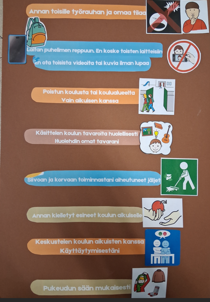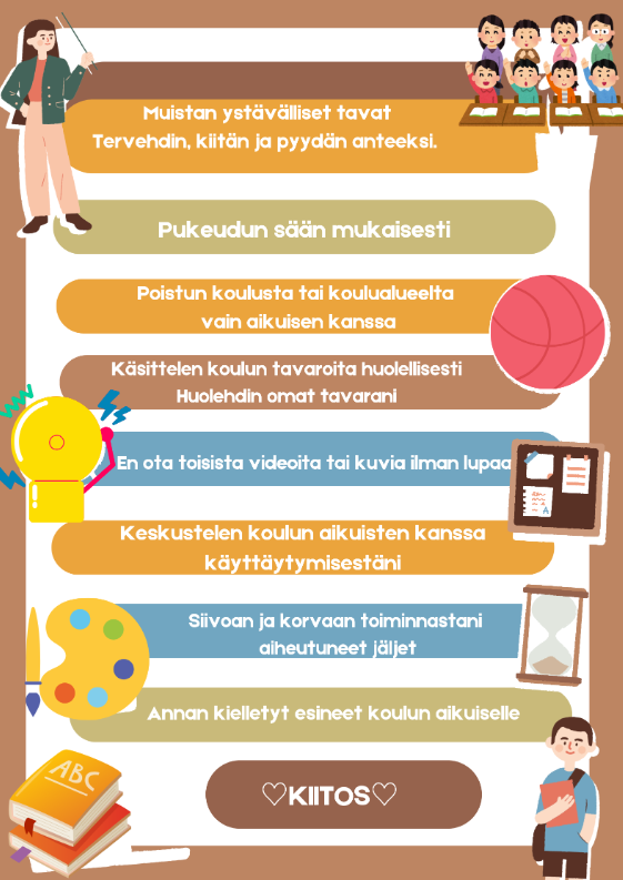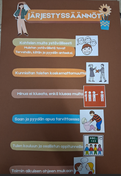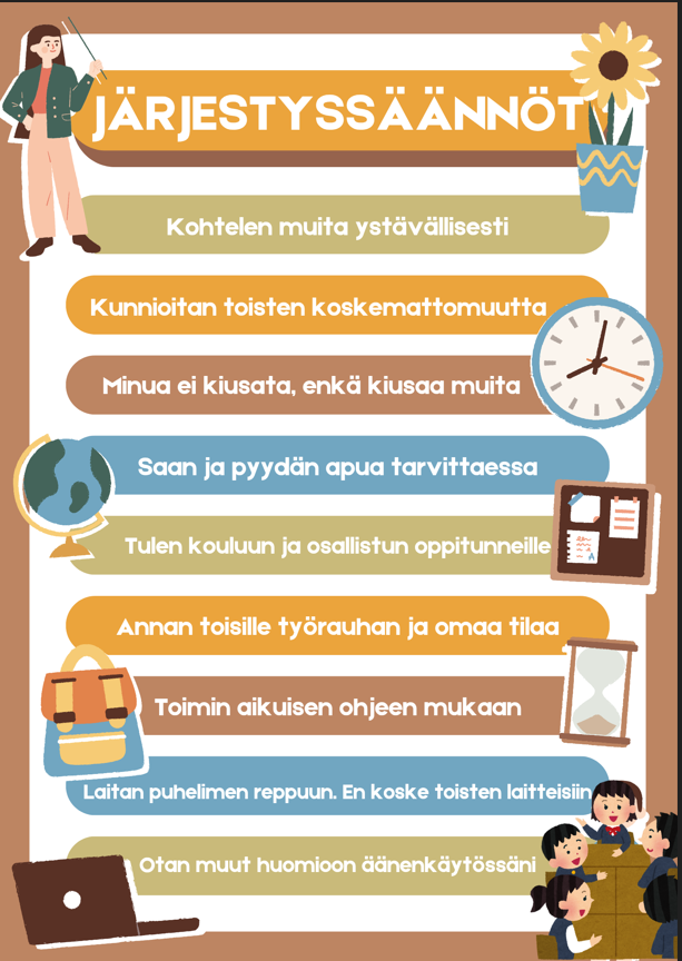 JÄRJESTYSSÄÄNNÖT KOULUN SEINÄLLE OPPILAILLE KUVITETTUNA: