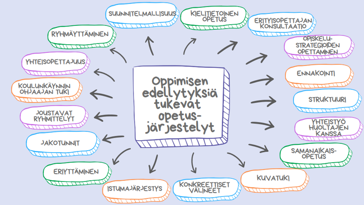 Alla olevassa kuvassa on tiivistetty oppimisen edellytyksiä tukevat opetusjärjestelyt koulussamme. Näitä kaikki toimia toteutamme koulun opetushenkilöstön kanssa pävittäisessä koulutyössämme.